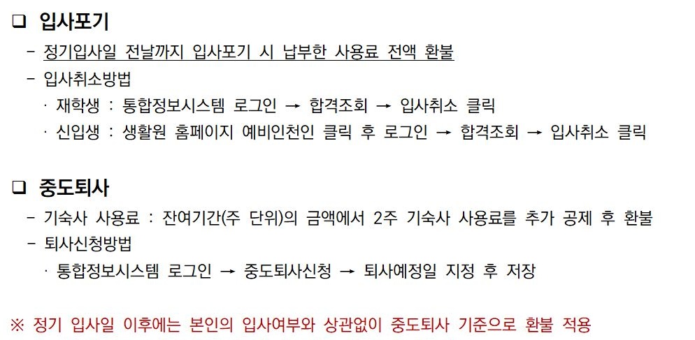 fnctId=bbs,fnctNo=1517 RSS 2.0 총 2 개의 게시물이 있습니다. 게시물 검색 제목 제목 작성자 검색어 입력 게시글 리스트 질문 입사포기 및 중도퇴사 기숙사사용료 환불 기준 안내 답변 질문 코로나19감염병 확산과 관련하여 자주하는 질문 사항(수정_5차 2/5) 답변 코로나19감염병 확산과 관련하여 자주하는 질문 사항 코로나19 감염병과 관련하여 자주하는 질문에 대해 알려드리고자 하오니 참고하시기 바랍니다. 해당 답변은 2021년 2월 5일 기준의 결정에 따른 것이며, 추후 감염병 확산 정도 및 학사일정 변경 등에 따라 추가 변경될 수 있습니다. Q1. 입사를 하게되면 입사 전에 기숙사 내에 짐을 둘 수 있나요? - 택배를 제외하고 기숙사내에 짐을 보관할 수 없습니다. Q2. 입사 시 가족이 와서 짐을 옮겨줄 수 있나요? - 코로나 19로 인해 기숙사생을 제외하고 가족, 친구 등 외부인의 출입이 제한됩니다. 이점 양해바랍니다. Q3. 기숙사 입사 제한 사항에 대해 알고 싶습니다. - 입사일 기준 14일 이내 유행지역 또는 국가 방문(경유포함)한 경우 - 입사일 기준 14일 이내 확진자와 밀접 접촉한 경우 - 입사일 기준 14일 이내에 자가격리 대상자로 격리중인 경우 - 발열 및 호흡기 증상이 있는 경우 - 또한 입사일 당일 마스크 미착용자, 발열 체크 등 확인사항 불응자, 외부인(가족 포함) 동행자 또한 입실이 제한됩니다. Q4. 코로나 19관련하여 생활원 대상 조치사항에 대해 알고 싶습니다. - 소독 : 손이 많이 닿는 곳 수시 소독, 손소독제 비치, 대인소독기 설치, 공기살균기 비치(일부) - 발열체크 : 체온계 비치, 열화상카메라 설치 - 출입제한 : 거리두기단계에 따른 공용공간 폐쇄, 정기 입사일 기숙사생 외 출입금지 - 행사제한 : 교양강좌, 집합교육 및 이벤트 등 진정시까지 운영 보류 - 홍보 : 코로나19관련 방송(한/영/중) 2회 실시, 포스터 및 홍보물 부착 생활원에서는 기숙사생의 건강과 안전을 위해 최선을 다하고 있습니다. 추가적인 조치사항에 대해 신속히 알려드리도록 하겠습니다. 감사합니다. 처음 11 1 끝